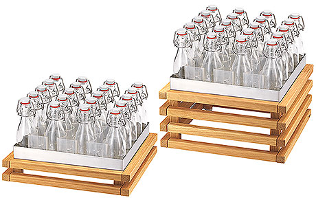 Base made of oak wood, stainless steel tray, 3 plastic cooling fins, 20 glass swing-top-bottles (0.2 liters)